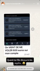 Pour la première fois, Alya Le Marchand paie des impôts… et cela semble lui faire tout drôle ! «On VIENT DE ME VOLER 600 euros sur mon compte», a envoyé la jeune femme à sa maman, en partageant une partie