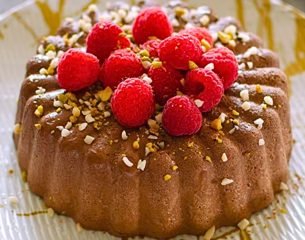 Retournez le moule sur une assiette de service et décorez le dessert avec quelques framboises fraîches.