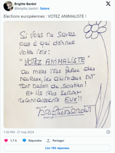 Le 27 mai dernier, Brigitte Bardot a publié un nouveau tweet sur X au sujet des élections européennes. Elle a ainsi écrit : “Si vous ne savez pas à qui donner votre voix, votez animaliste”. Puis, elle a ajouté : “Au moins, vous ferez des heureux, les animaux ont tant besoin de soutien ! Et ils vous seront reconnaissants, EUX”. Depuis, Brigitte Bardot ne s’est pas exprimée au sujet des prochaines élections législatives. Il semblerait que l’actrice se soit détachée du parti de Marine Le Pen. Pour Brigitte Bardot, le plus important, c’est le droit des animaux et rien d’autre.
