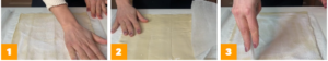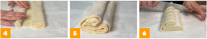 Tracez une ligne imaginaire au milieu du rectangle et pliez la première moitié sur elle-même puis repliez-la à nouveau. Tu devrais plutôt rouler l’autre moitié 4, comme vous le voyez dans la vidéo. Saupoudrer à nouveau de sucre 5 et coupez des tranches d’environ 3-4 cm de large 6