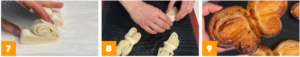 Divisez les tranches en deux 7, ouvrez-les et disposez-les sur une plaque à pâtisserie recouverte de papier sulfurisé 8. Cuire les 10 premières minutes à 200°C. Baissez la température à 175°C et terminez la cuisson (environ 15 minutes) jusqu’à ce qu’ils soient dorés. 9.