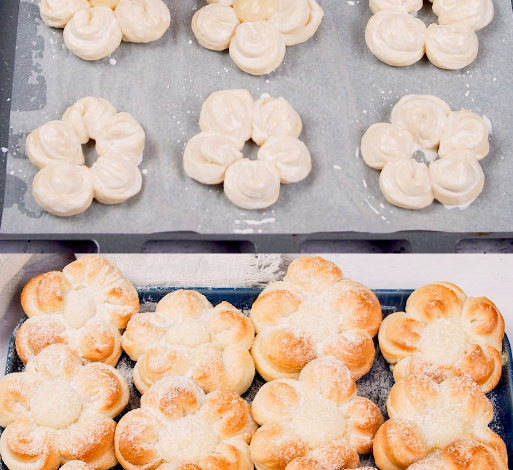 5. Badigeonnez chaque fleur d’un peu de crème et déposez une cuillerée de crème anglaise au milieu. Cuire au four pendant 18 à 20 minutes. Servir saupoudré de sucre en poudre.