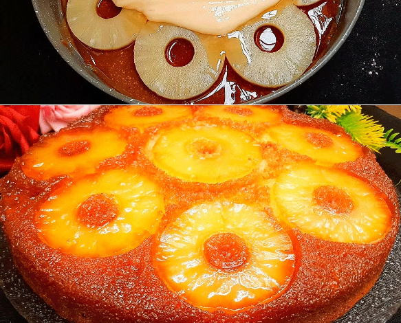 ajoutez les oeufs un par un tout en fouettant, ensuite ajoutez la farine et la levure tamisée,puis Versez la préparation sur les rondelles d’ananas.