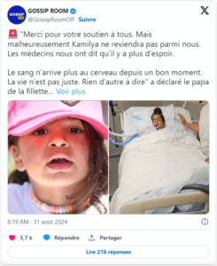 Vendredi 30 août 2024, dans l’après-midi, le père de Kamilya a donné des nouvelles de l’état de santé de sa fille. “Merci pour votre soutien à tous.