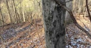 Sur cette photo, vous remarquerez qu’il s’agit d’une forêt. Ce cliché a probablement été pris en hiver puisqu’on voit un tapis de feuilles mortes sur le sol.