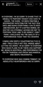 “Je suis désolée de vous apprendre que je suis incapable de performer ce soir et que je suis obligée d’annuler le show”, a-t-elle écrit, visiblement affectée par la situation.