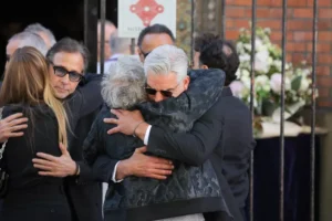 Avant de faire son entrée dans l’édifice religieux, Laeticia Hallyday s’est empressée de prendre dans ses bras Shana Chasman, la fille aînée de Nadia Farès. Après lui avoir adressé de tendres mots, la compagne de Serge