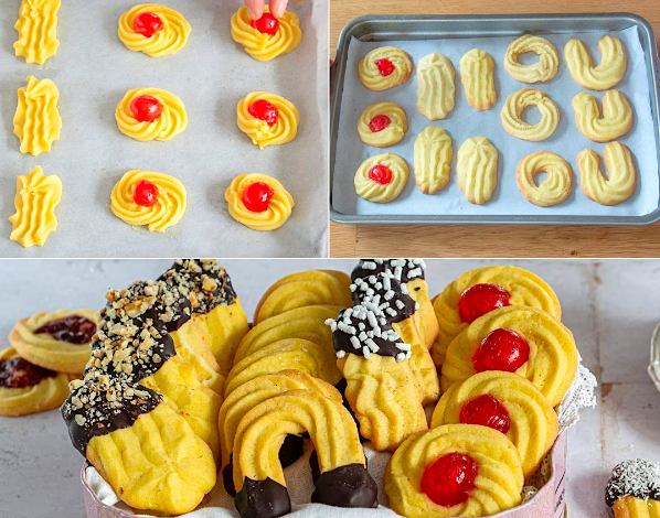 Déposez une demi-cerise confite au centre de quelques biscuits. Laissez ensuite les biscuits reposer au réfrigérateur pendant au moins une heure.
