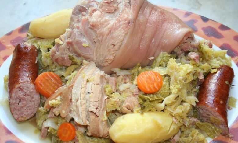 #9. Avant de servir, retirez le bacon et les saucisses, coupez-les en morceaux d’environ 1 cm d’épaisseur, et remettez-les dans la marmite pour qu’ils soient bien chauds.