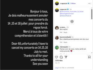 L’entourage de Renaud Capuçon tient tout de même à rassurer le public en précisant que le musicien, soucieux de préserver sa santé et la qualité de ses prestations,