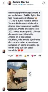 explique pour commencer sa mère avant de poursuivre en ces termes : “En 2021, nous avons perdu Litchee de manière accidentelle. Ambre en a beaucoup souffert. Elle a eu le syndrome du cœur brisé et a passé une semaine en soins intensifs.