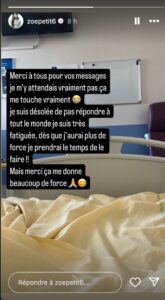 Je suis désolée de ne pas répondre à tout le monde, je suis très fatiguée, dès que j’aurai plus de force, je prendrai le temps de le faire !”, a-t-elle écrit. Malgré ce message, Zoé Petit n’a pas précisé la raison de son hospitalisation.